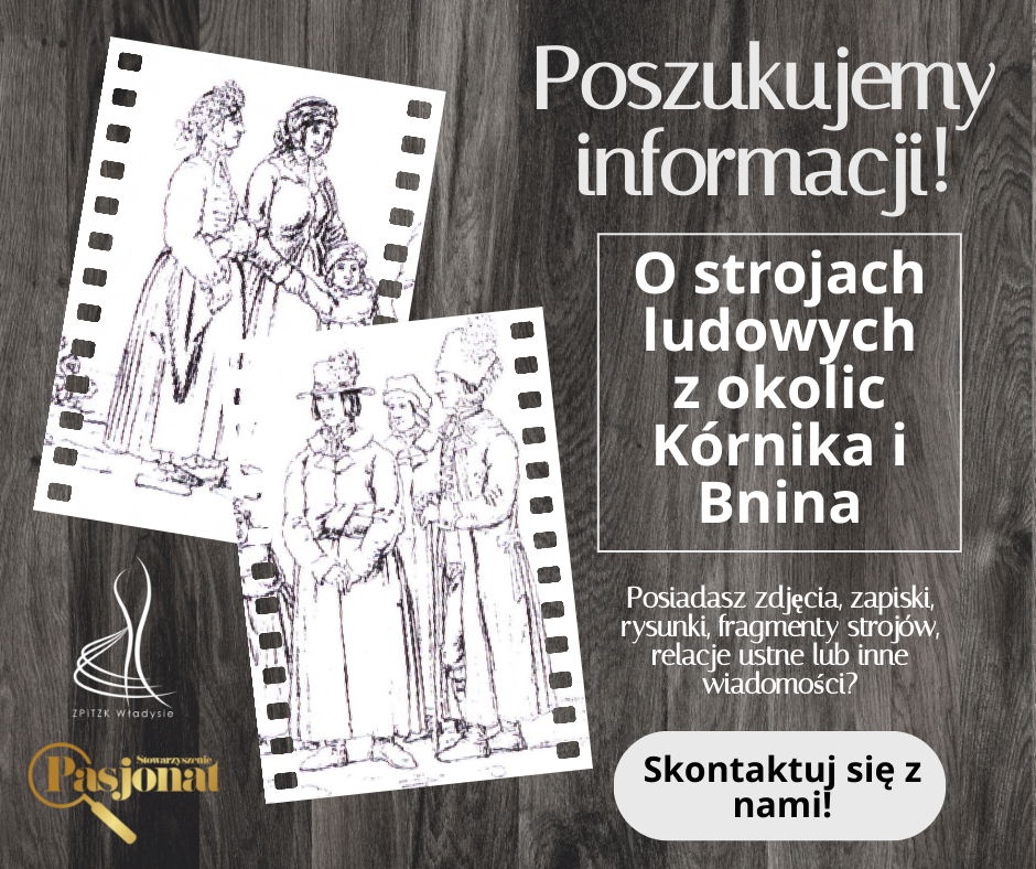 Poszukujemy wszelkich informacji tj. zdjęć, zapisków, rysunków, fragmentów strojów, relacji ustnych i każdej innej wiadomości, która pozwoli nam skompletować informacje o odświętnych strojach ludowych z okolic Kórnika i Bnina z XIX i XX wieku.