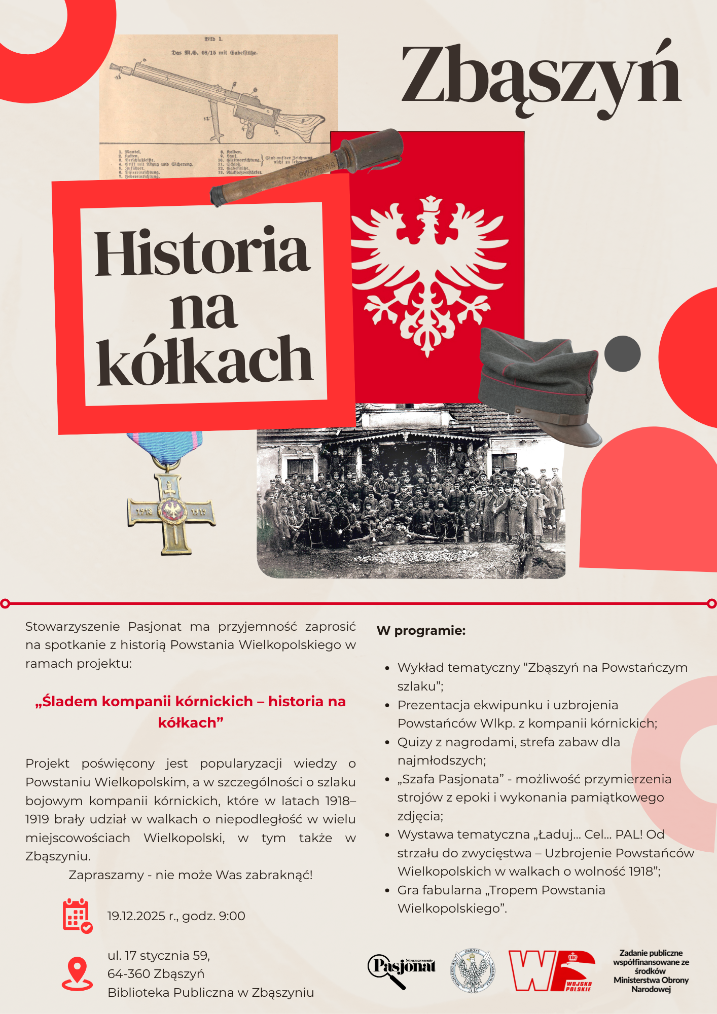 Stowarzyszenie Pasjonat ma przyjemność zaprosić na spotkanie z historią Powstania Wielkopolskiego w ramach projektu: „Śladem kompanii kórnickich – historia na kółkach” Projekt poświęcony jest popularyzacji wiedzy o Powstaniu Wielkopolskim, a w szczególności o szlaku bojowym kompanii kórnickich, które w latach 1918–1919 brały udział w walkach o niepodległość wielu miejscowości Wielkopolski, w tym także Zbąszynia.